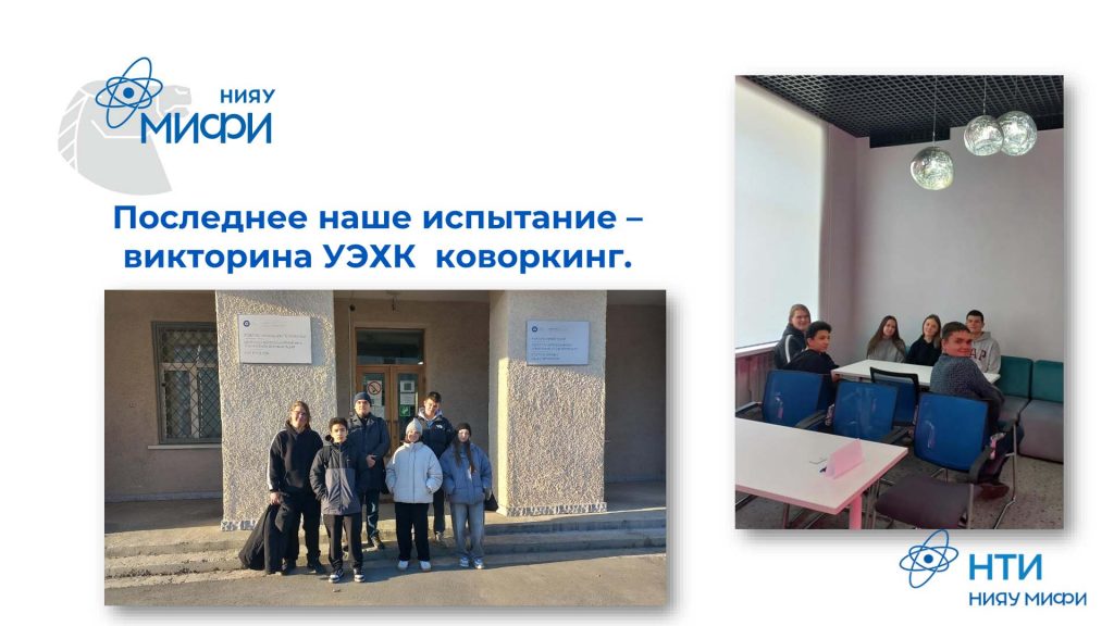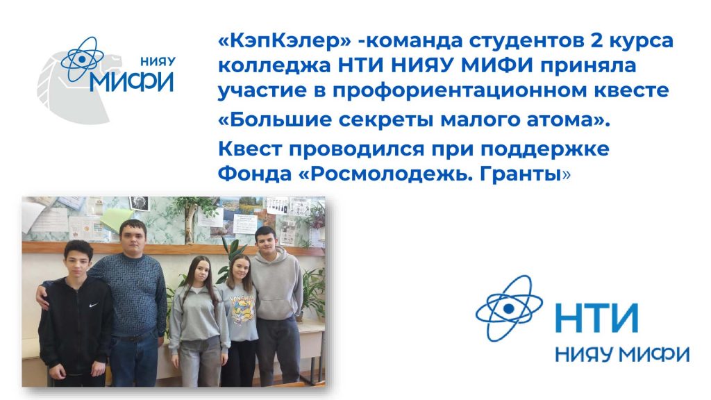 Команда студентов коллежа НТИ НИЯУ МИФИ «КэпКэлер» приняла участие в городском профориентационном квесте «Большие секреты малого атома», котороый поводился при поддержке Фонда «Росмолодежь.Гранты» и посвящен 80-летию Атомной промышленности и 85-летию системы СПО.