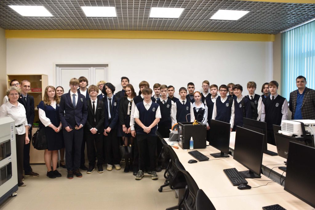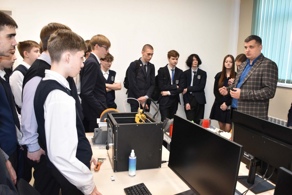 В завершении встречи школьники побывали в лаборатории Аддитивных технологий и 3D моделирования, где зам. руководителя НТИ Б.А. Гупалов познакомил их с современным технологичным оборудованием, на котором студенты вуза практикуются в программировании и изготовлении деталей на 3D принтерах.