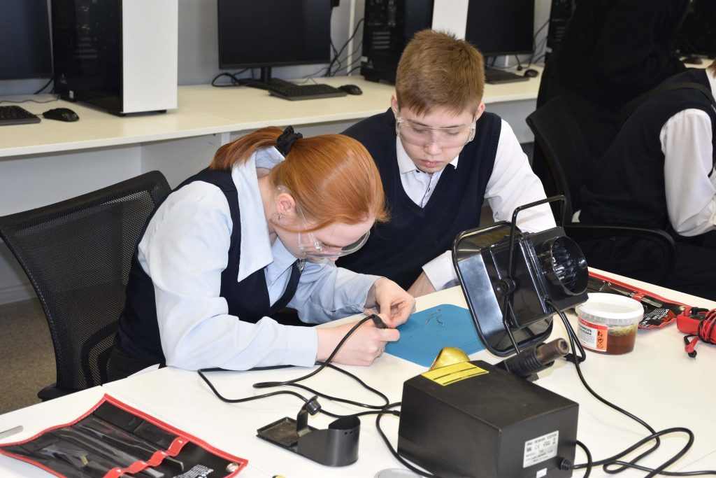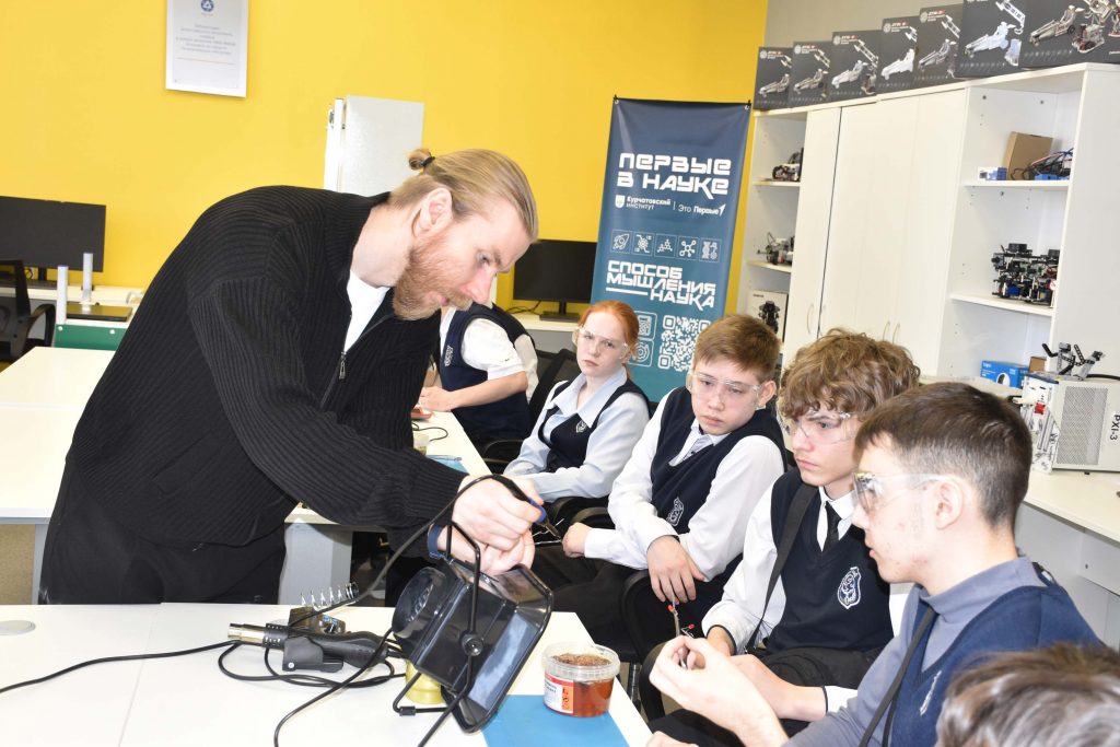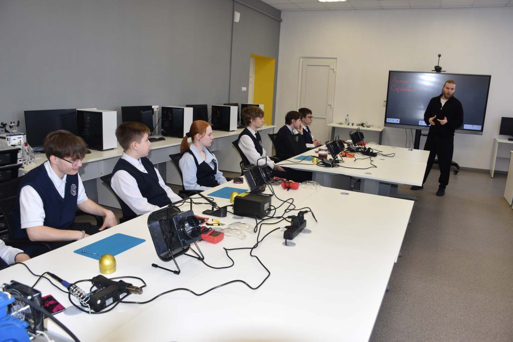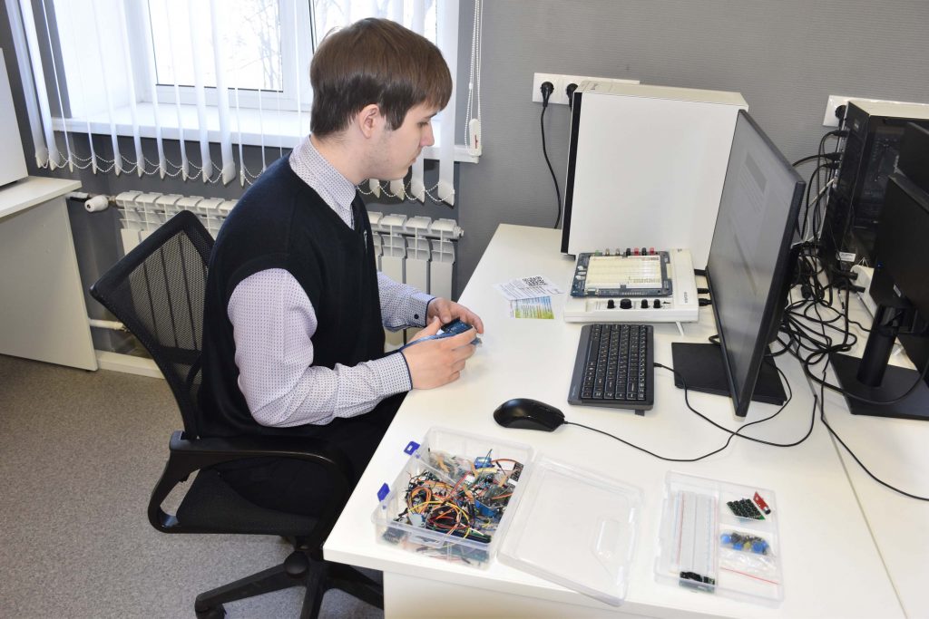 Вторая подгруппа школьников в это время в лаборатории Искусственного интеллекта вместе с преподавателем А.С. Оборотневым рассмотрела принцип работы электронных устройств, разложив по полочкам какая их часть занимается «мыслительной деятельностью», какая отвечает за прием информации из окружающего мира и какие исполнительные устройства бывают. На практике ребята осуществили пайку небольшой системы, запрограммировали её и в конечном итоге получили работающую систему. Для некоторых школьников это был первый опыт работы с паяльным оборудованием и микроконтроллерами – основой базовой робототехники.